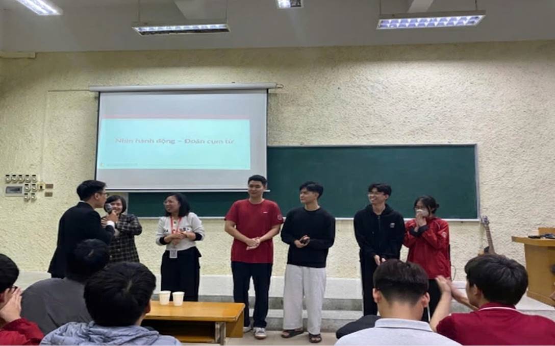 Đáng chú ý, phần giao lưu với khán giả thông qua trò chơi “Nhìn hành động - đoán cụm từ” không chỉ thu hút sự tham gia hào hứng của sinh viên mà còn có sự góp mặt trực tiếp của các thầy cô giảng viên. Việc thầy cô cùng tương tác và hòa mình vào hoạt động chung đã góp phần tạo nên bầu không khí cởi mở, gần gũi và thoải mái.